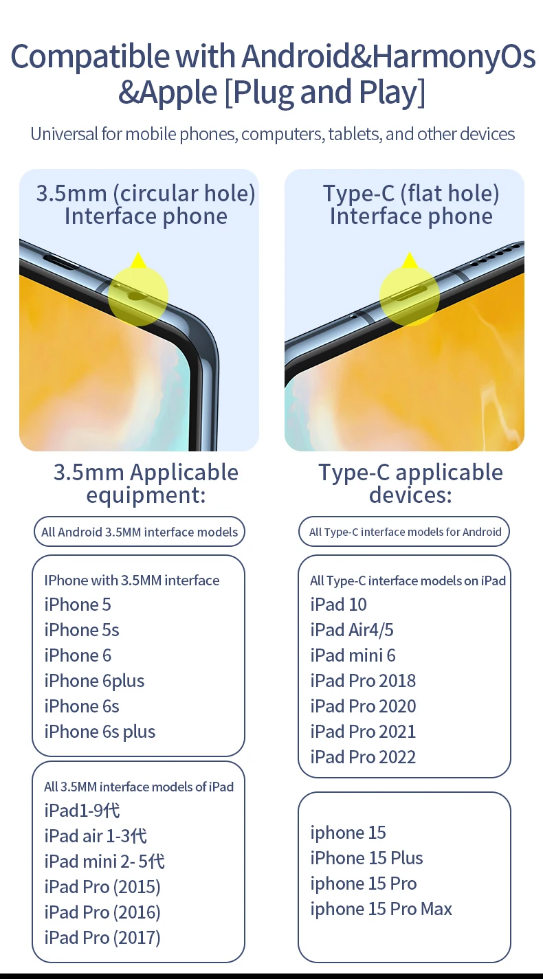 ?Sobre Type-C (chip digital): Compatível com 99% de telefones celulares com interface Type-C, como iPhone série 15, Samsung, Huawei, Xiaomi e outros telefones celulares Android.