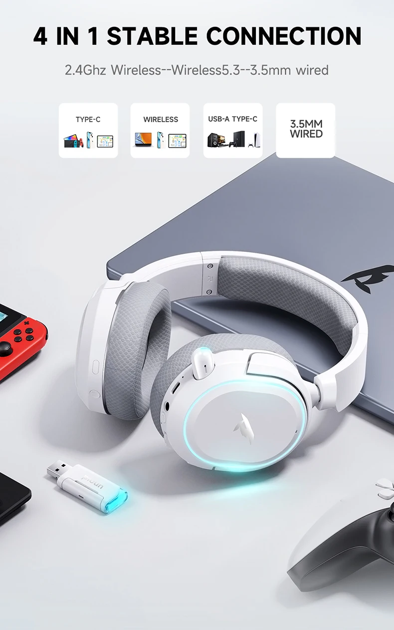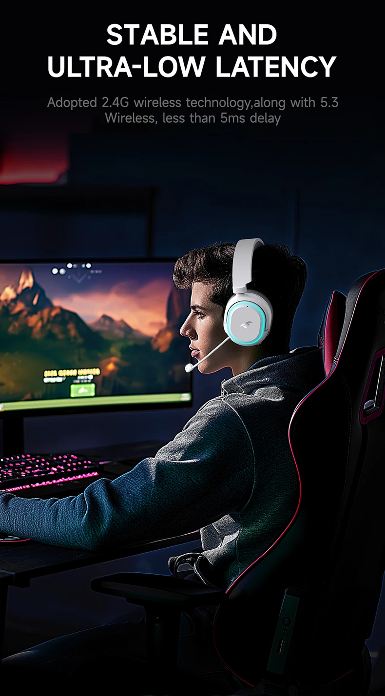Suporta transmissão estável com tecnologia sem fio de 2,4 GHz e Bluetooth 5.3, oferece uma experiência de conexão mais conveniente, estável e confiável.Com suporte para múltiplas conexões de dispositivos, permite que você aproveite sem restrições